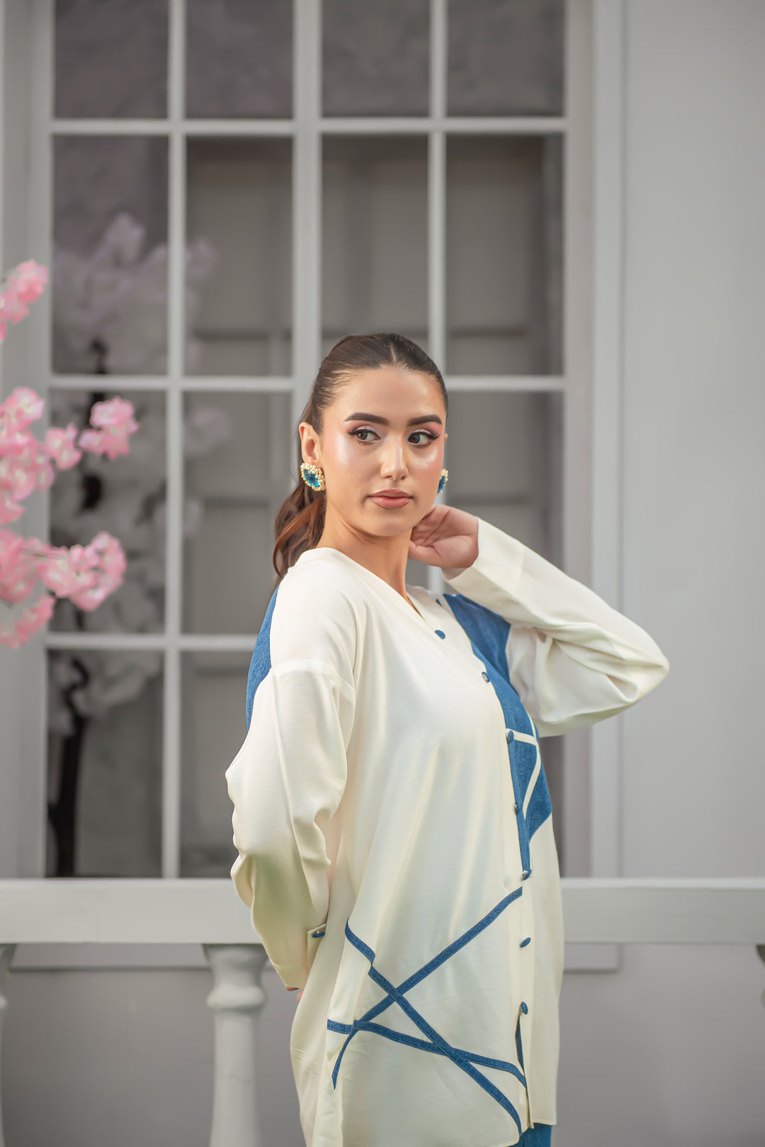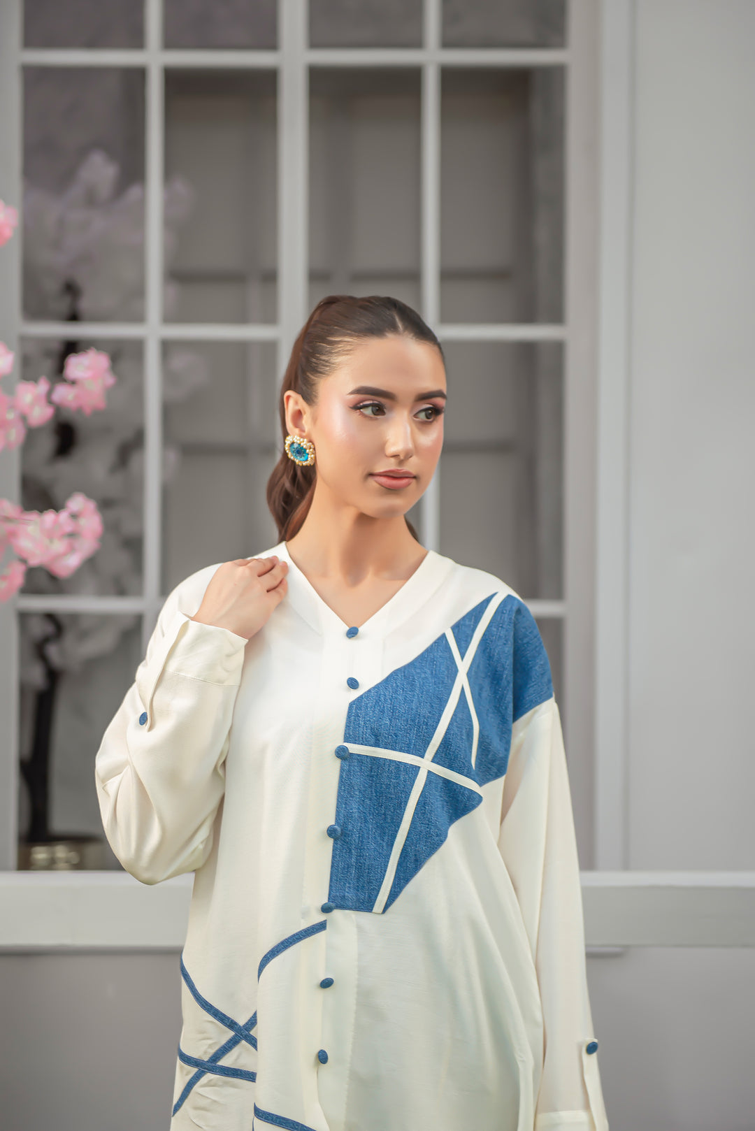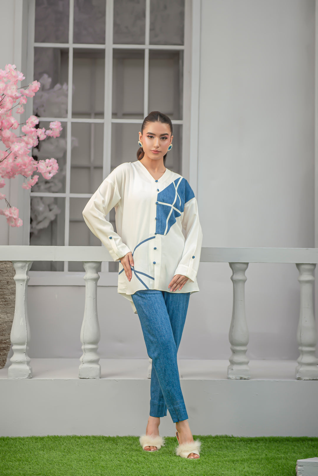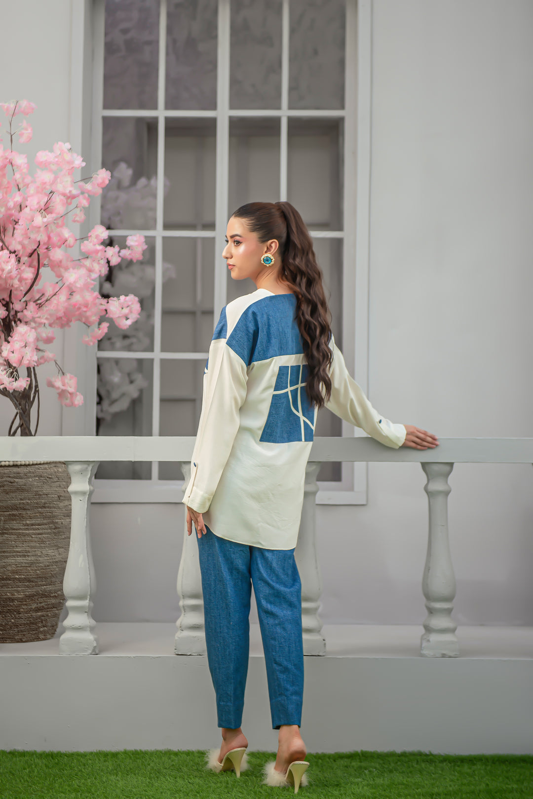 An elevated fusion of textures — this set pairs a white dull silk shirt with sleek blue denim straight pants. The soft sheen of silk meets the casual chic of denim, creating a bold yet balanced outfit suitable for both day and evening wear.