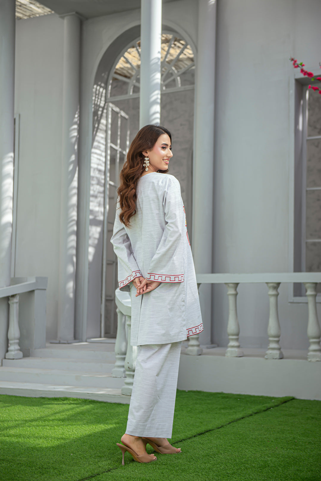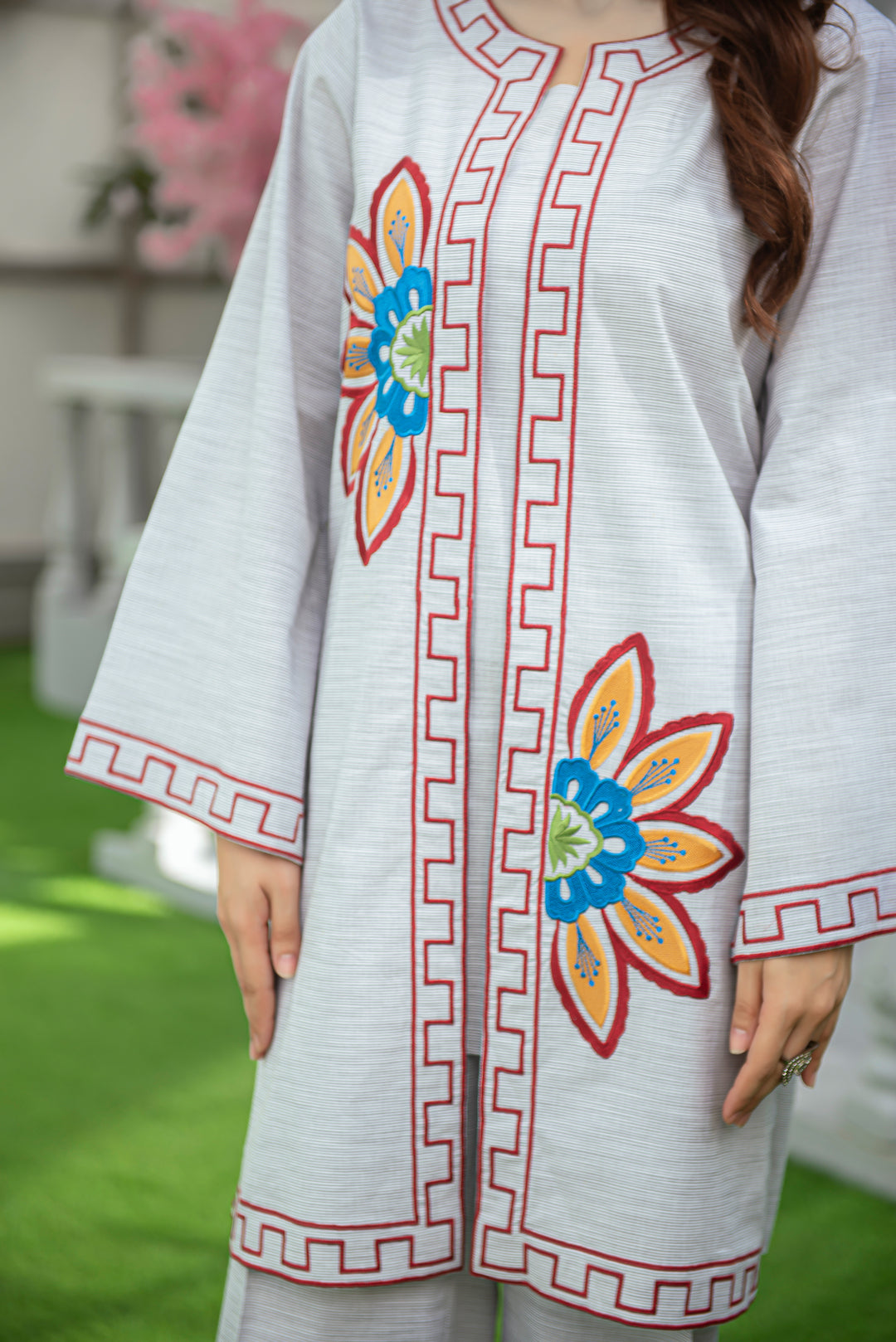 Artfully detailed with floral and geometric embroidery, this light grey cotton co-ord brings together tradition and modernity. The embroidered front and sleeves elevate its simple structure, while the breathable fabric ensures day-long comfort.