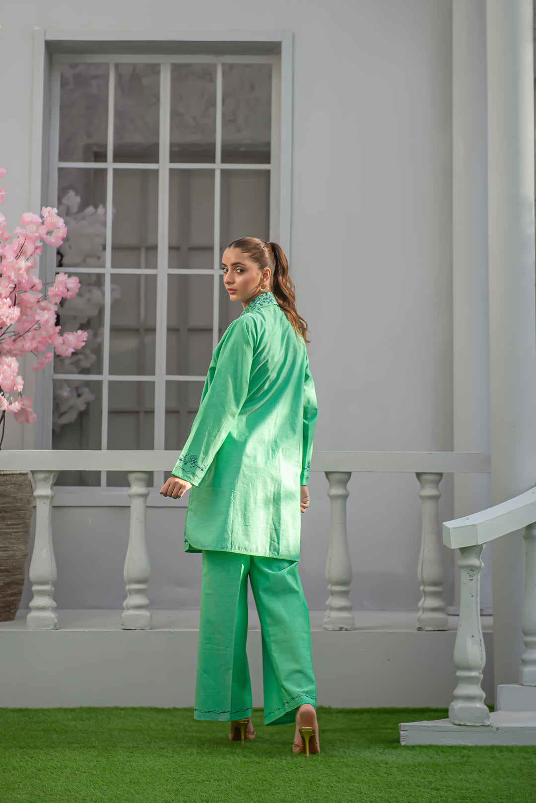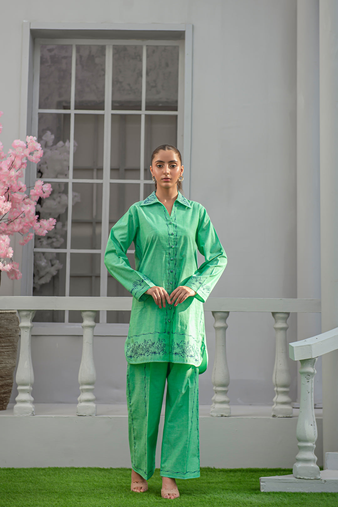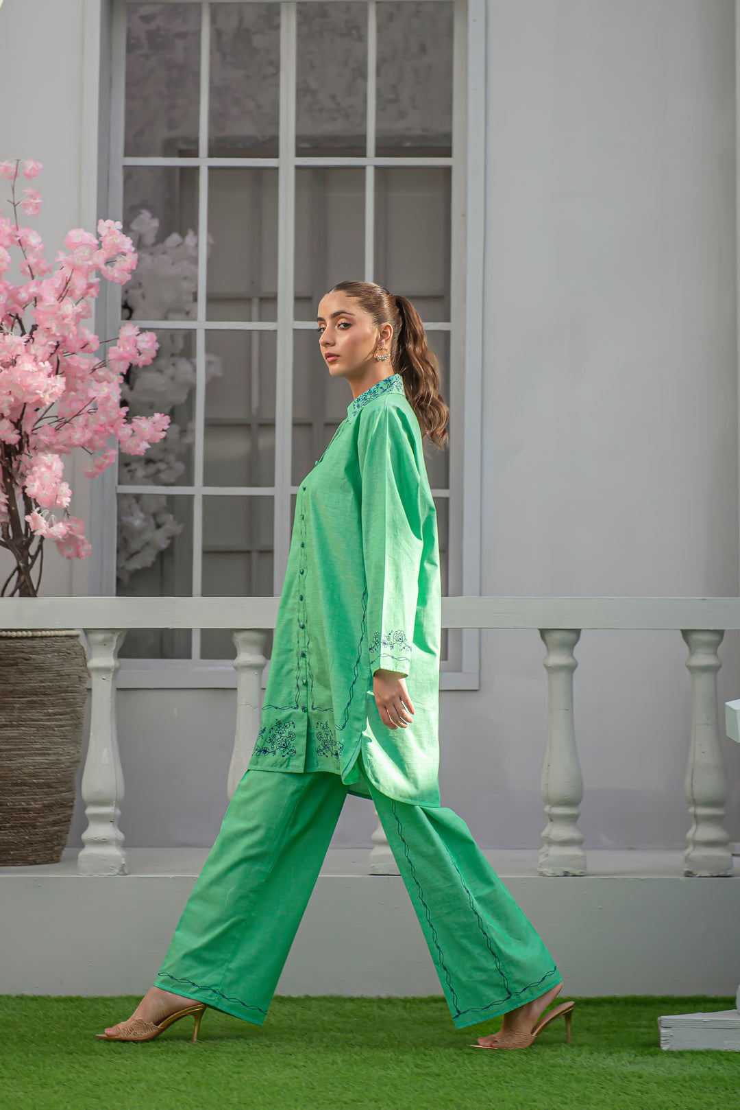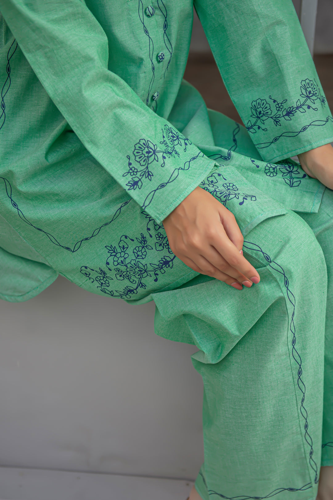 Vibrant yet refined — this green cotton outfit showcases modern screen printing across the front, sleeves, and culottes. The crisp silhouette and breathable fabric make it perfect for daily wear, combining ease, color, and chic simplicity.