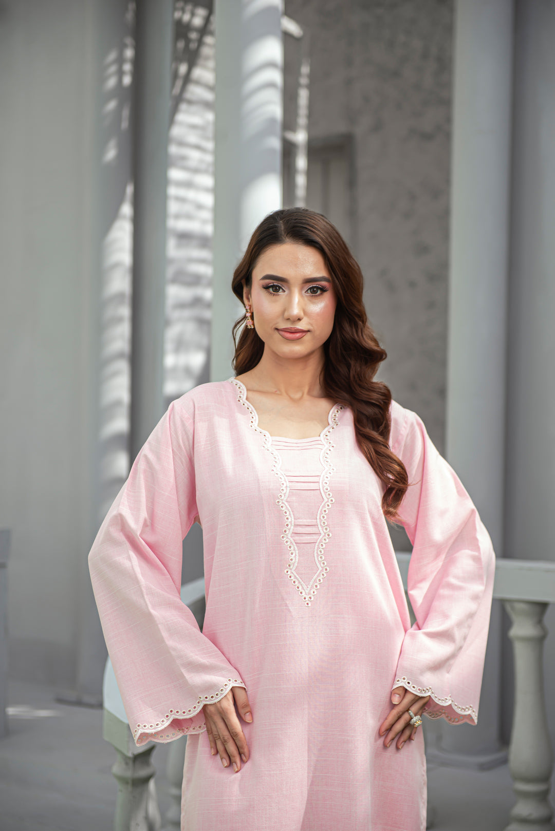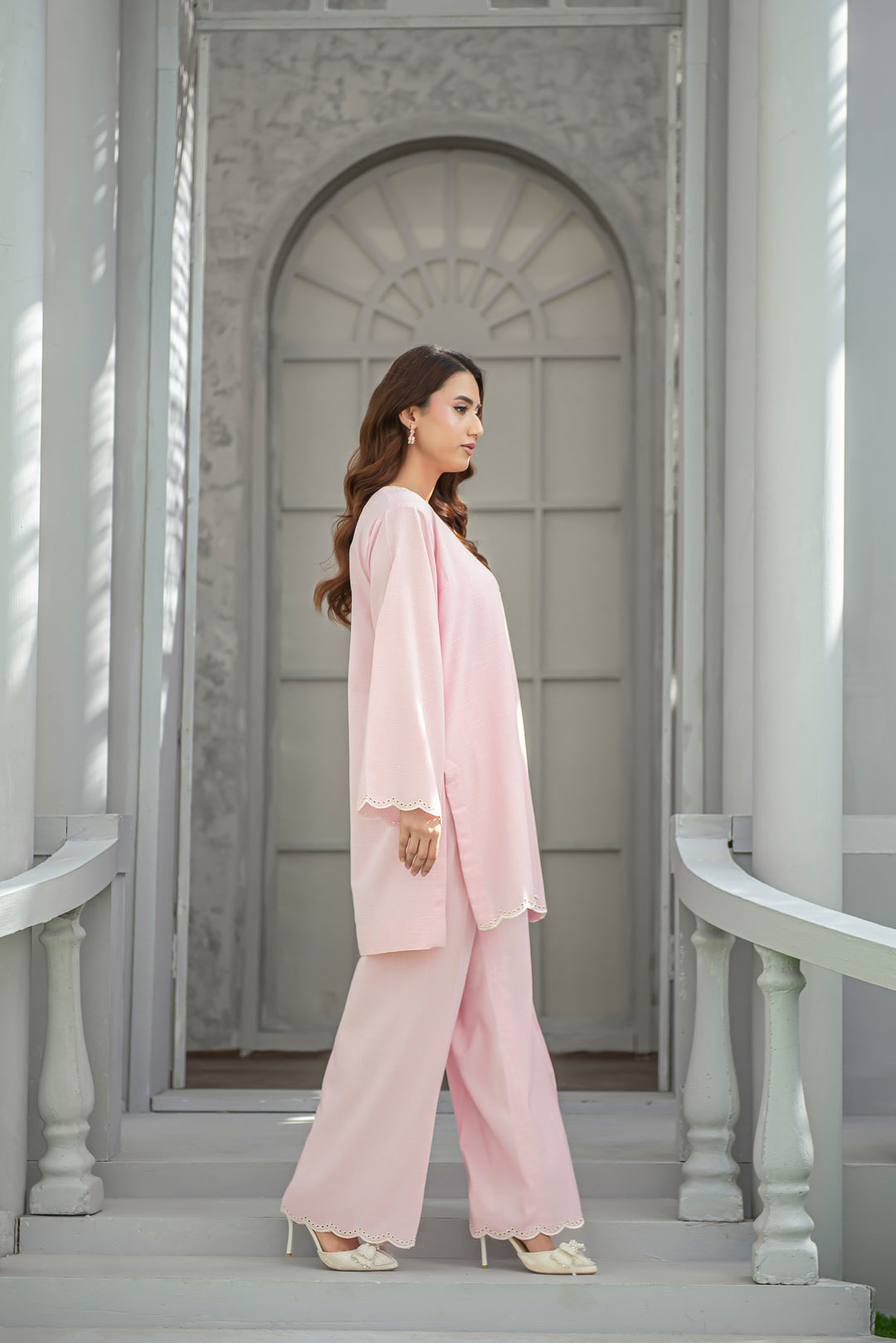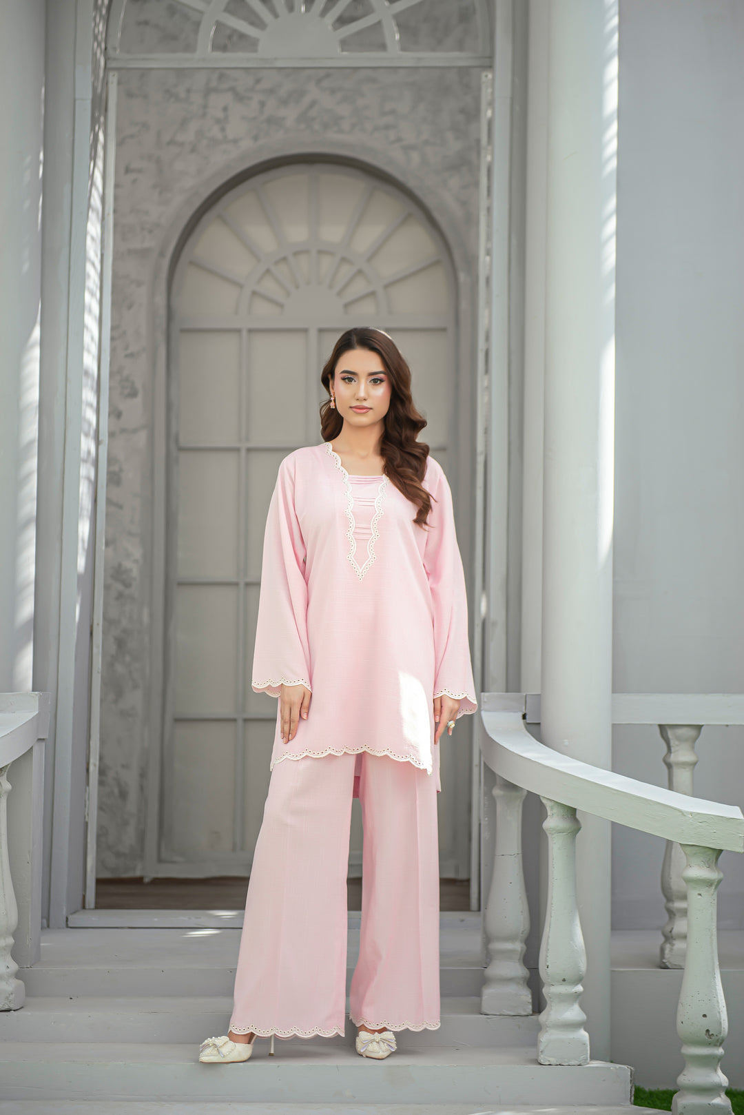 A graceful cool pink ensemble crafted from soft wash n wear fabric, designed with elegant embroidery on the neckline and culottes. Light, feminine, and versatile — it’s an ideal choice for casual meet-ups or understated festive occasions.