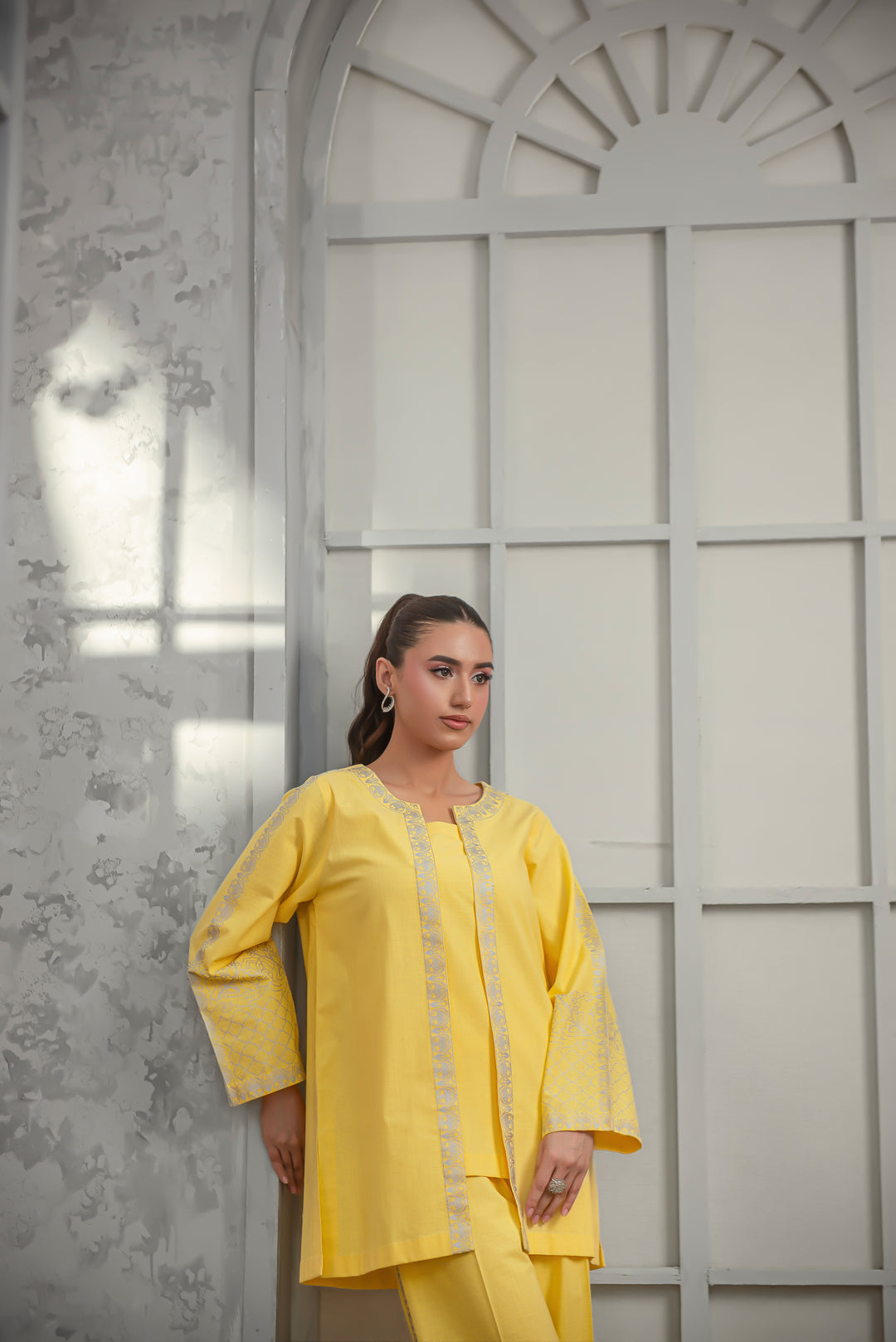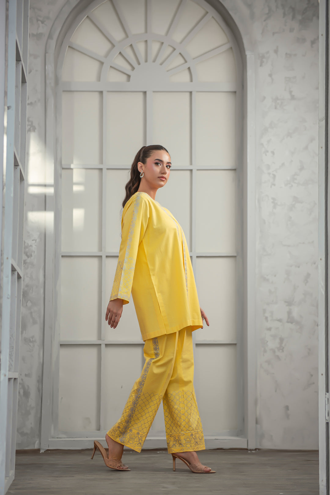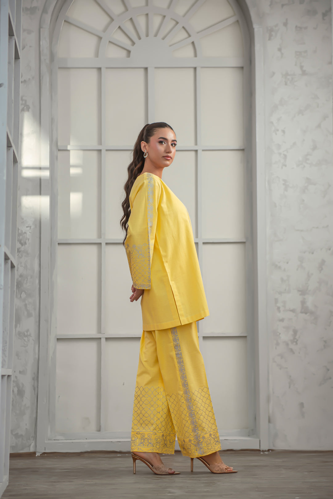 This lemon cotton co-ord set radiates freshness and charm. The shirt and sleeves are adorned with contemporary screen-printed patterns, echoed beautifully on the culottes. The breezy cut and soft fabric make it an ideal choice for casual daytime wear with a touch of playfulness.