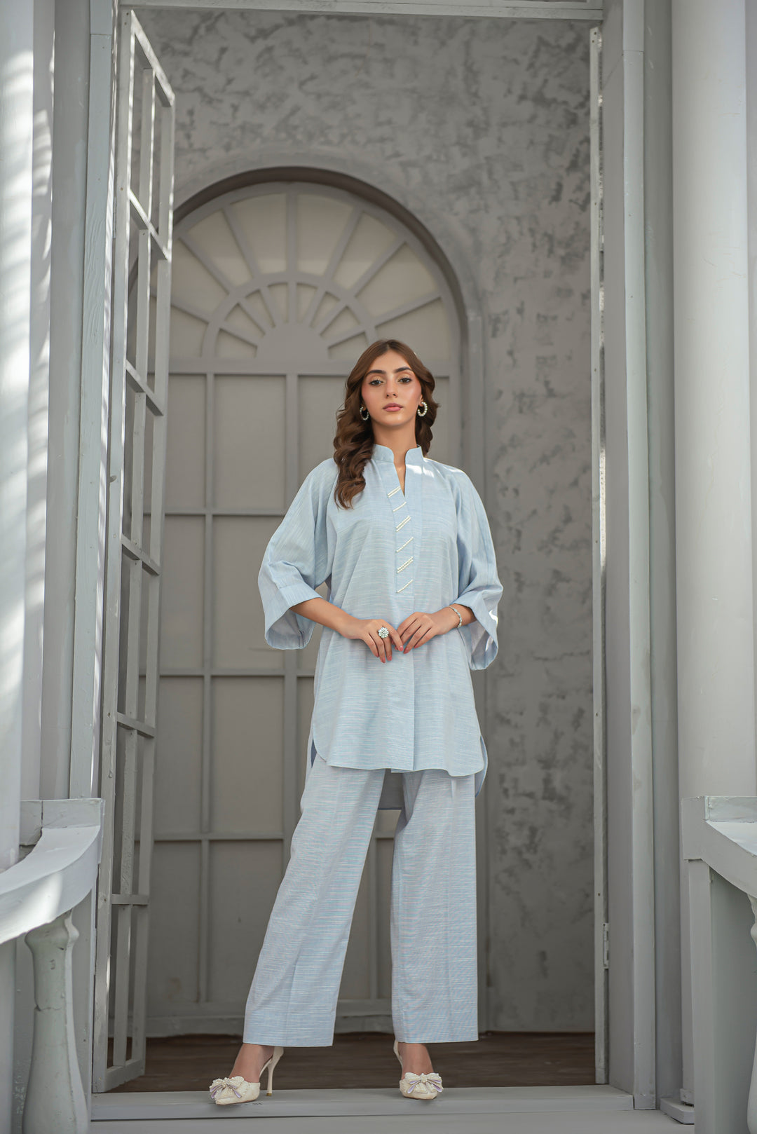 A soothing sky-blue outfit in easy-care wash n wear fabric, featuring pearl embellishment on the neckline for a subtle touch of elegance. The relaxed culotte pants complete the look, making it perfect for warm-weather gatherings and effortless sophistication.